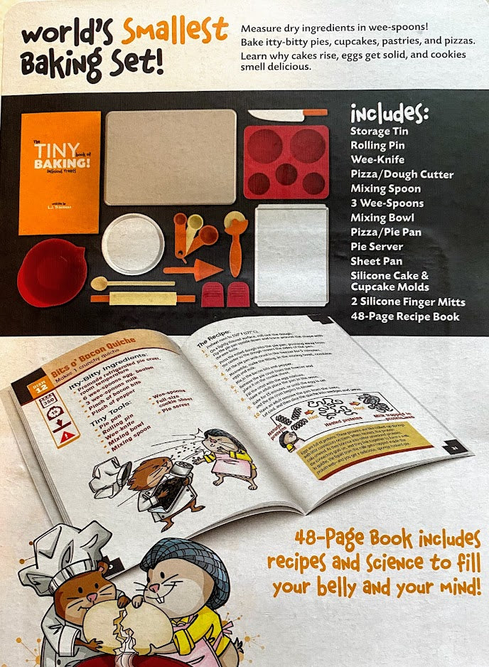 World's smallest baking set! Big Science. Tiny Tools. 20 enormously delicious recipes. 17 pieces. Ages 8+.