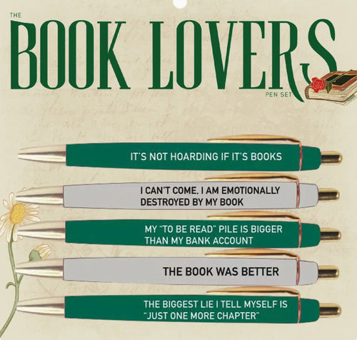 An assortment of pen sets. We have comedic quips on our sets of 5 black ink ballpoint pens.